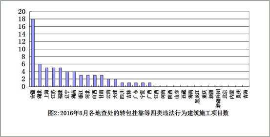 從查處的轉(zhuǎn)包、掛靠等四類違法行為看,安徽、湖北省查處項(xiàng)目相對(duì)較多(見(jiàn)圖2)。