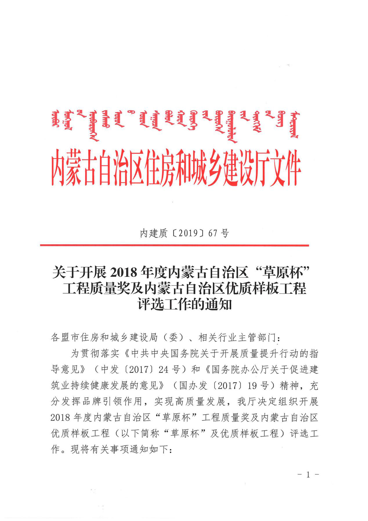 關(guān)于開展2018年度內(nèi)蒙古自治區(qū)“草原杯”工程質(zhì)量獎(jiǎng)及內(nèi)蒙古自治區(qū)優(yōu)質(zhì)樣板工程評(píng)選工作的通知
