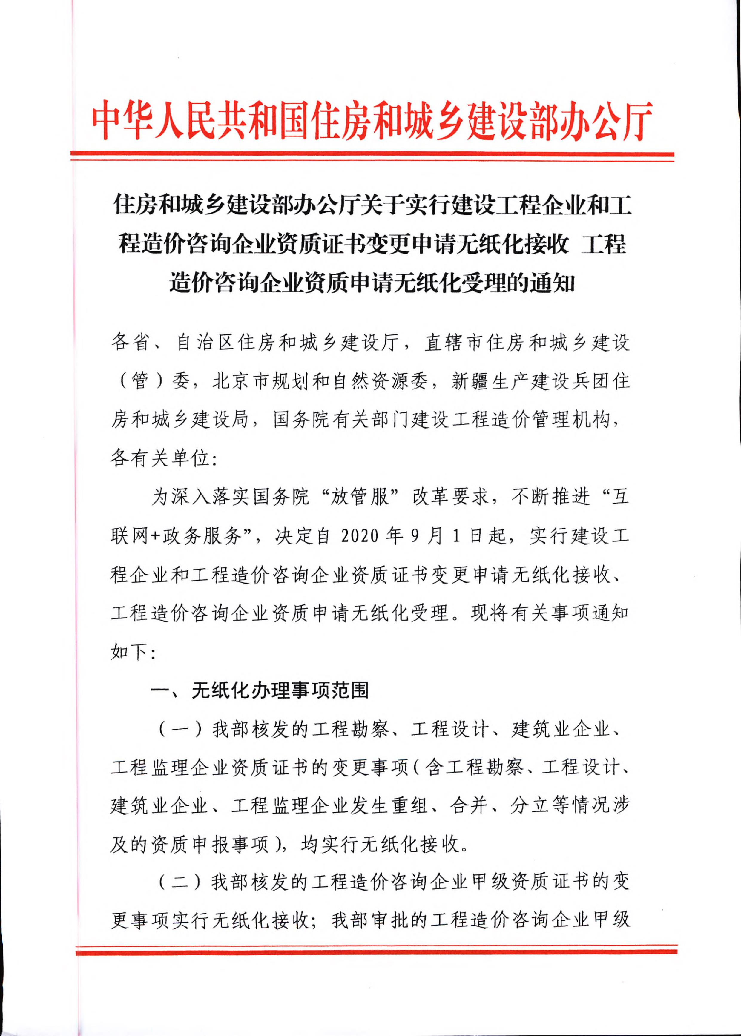 住房和城鄉(xiāng)建設(shè)部辦公廳關(guān)于實(shí)行建設(shè)工程企業(yè)和工程造價(jià)咨詢企業(yè)資質(zhì)證書變更申請(qǐng)無紙化接收 工程造價(jià)咨詢企業(yè)資質(zhì)申請(qǐng)無紙化受理的通知