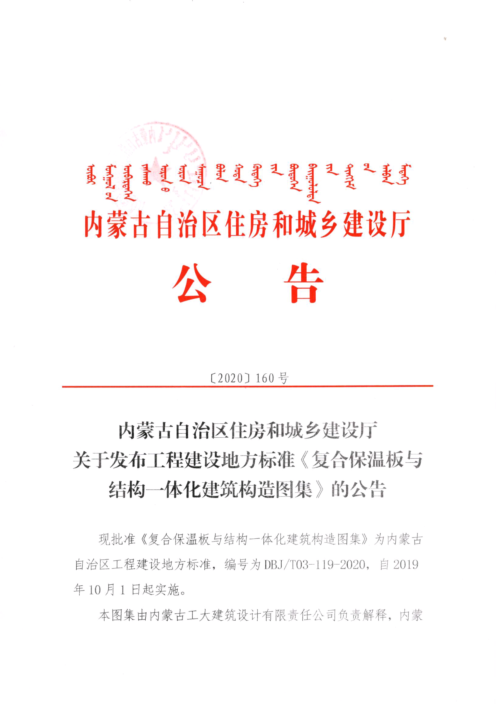內蒙古自治區(qū)住房和城鄉(xiāng)建設廳關于發(fā)布工程建設地方標準《復合保溫板與結構一體化應用技術規(guī)程》的公告