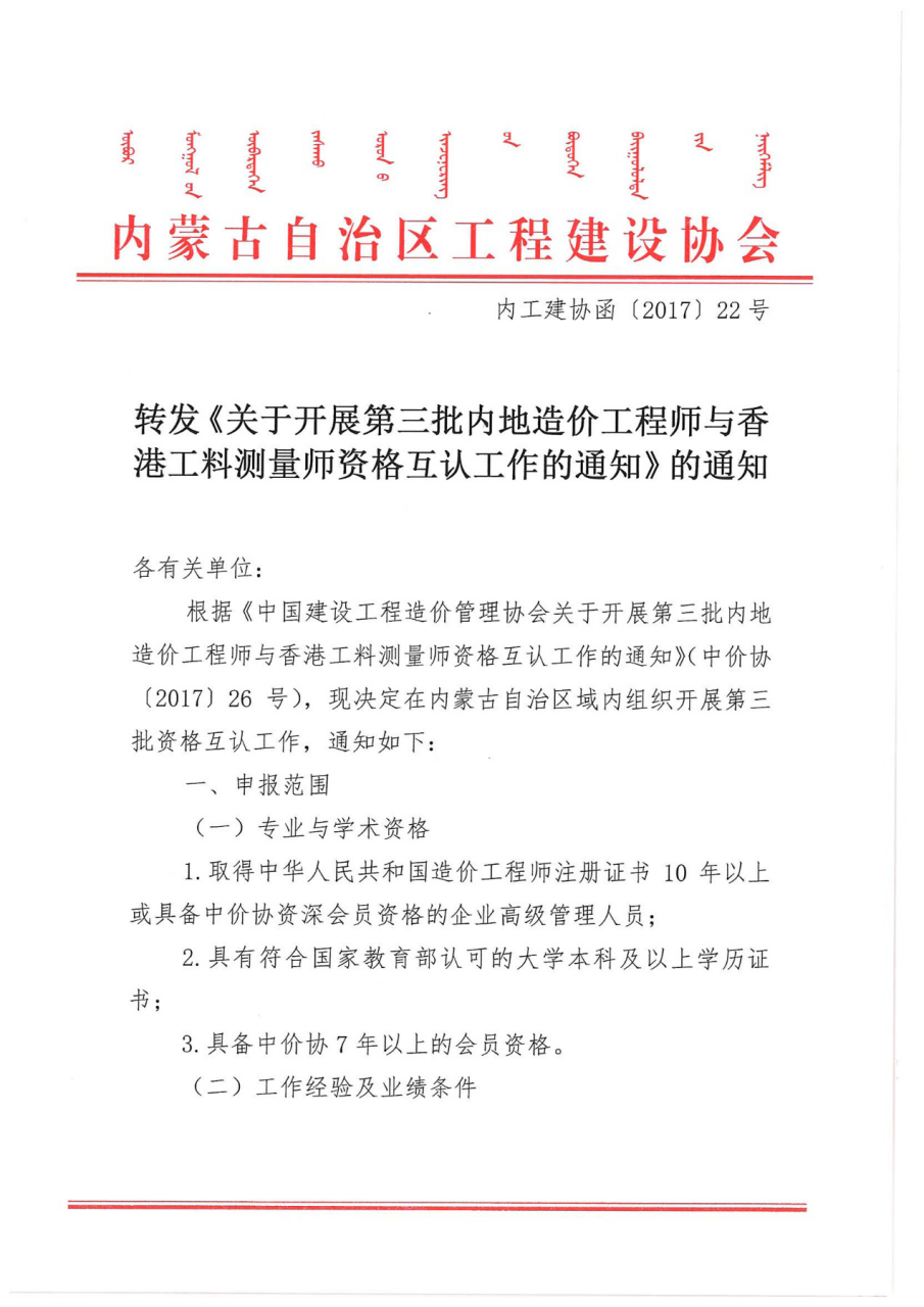 附件:1. 《關(guān)于開(kāi)展第三批內(nèi)地造價(jià)工程師與香港工料測(cè)量師資格互認(rèn)工作的通知》(中價(jià)協(xié)〔2017〕26號(hào)).docx